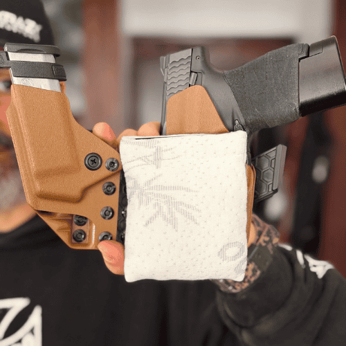 A holster wedge is a foam or rubber pad that attaches to the back of an IWB holster, angling the grip into the body for better concealment and comfort. The Cloudster Pillow holster wedge uses adjustable shredded cooling gel memory foam with a breathable fabric cover, letting you customize thickness for all-day appendix or strong-side carry without hot spots or pressure points.